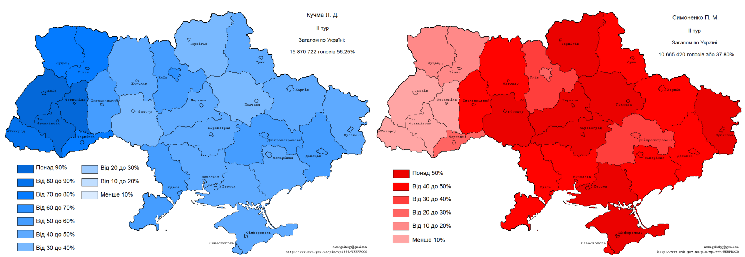 1999 год Кучма (Черниговская область) — Симоненко (Донецк). Похоже, что Кучме удалось сохранить баланс. С другой стороны коммунист Симоненко уж слишком олицетворяет советское прошлое. Побеждает запад.