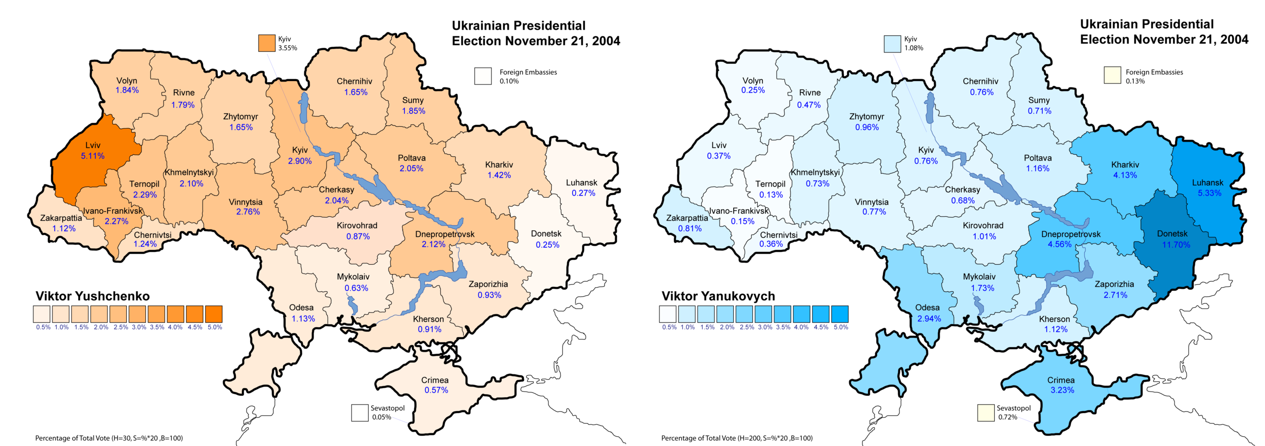 2004 год Ющенко (Сумская область) — Янукович (Донецкая область). Поляризация очень сильна, с минимальным перевесом побеждает запад.