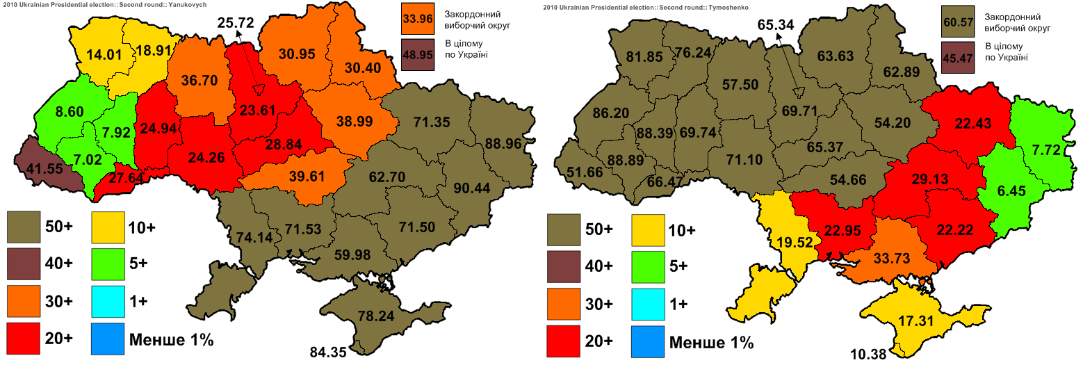 2010 год Янукович (Донецкая область) — Тимошенко (Днепропетровск). Побеждает восток.